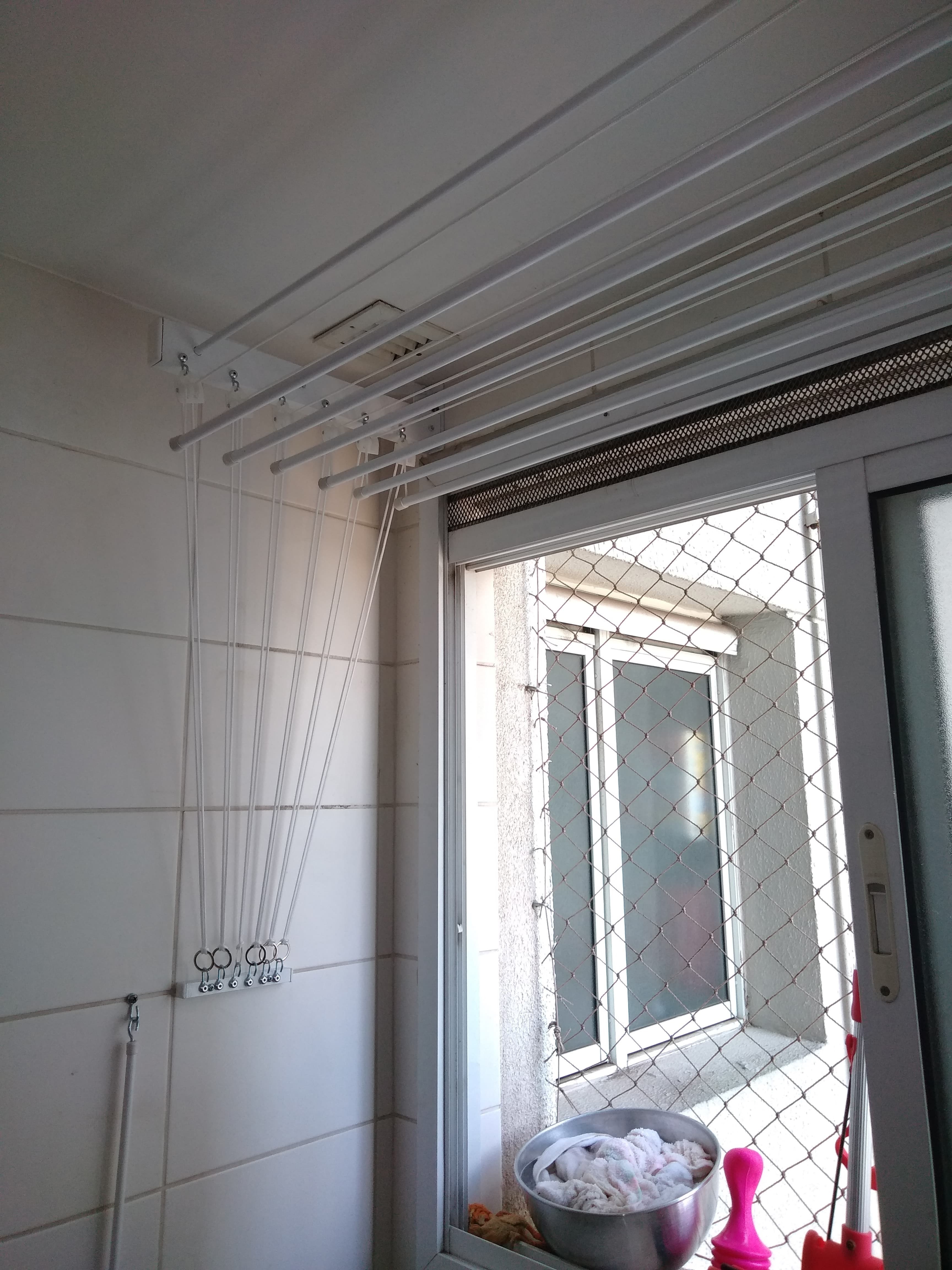 Varal com acionamento manual vareta a vareta, o que possibilita melhor locomoção em áreas de serviço compactas.