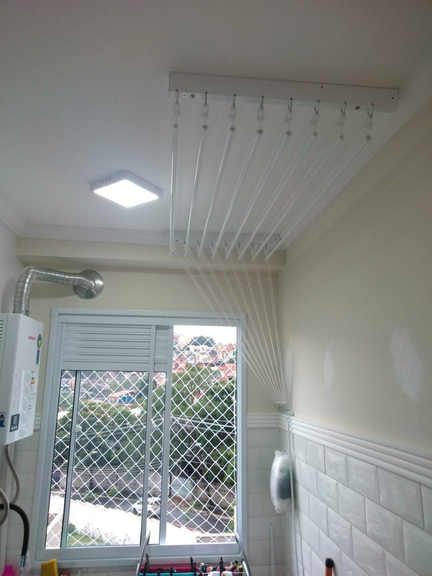Instalado em teto de laje ou em teto com rebaixo de gesso, utilizando sistema seguro e apropriado para não danificar e suportar o peso do varal.